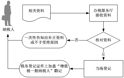 。1)辦稅服務(wù)廳接收資料,核對資料是否齊全、是否符合法定形式、填寫內(nèi)容是否完整,符合的錄入相關(guān)信息,并在稅務(wù)登記證件上加蓋“增值稅一般納稅人”戳記。不符合的當(dāng)場一次性提示應(yīng)補(bǔ)正資料或不予受理原因。